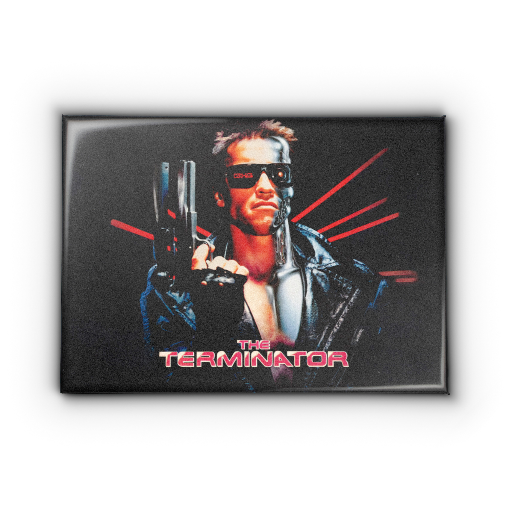 Against a stark background sliced by red targeting lasers, Arnold Schwarzenegger’s T-800 fixes his steely gaze from behind those unforgettable shades, weapon raised. This is the very image of 80s dystopian dread, a chilling blend of man and machine that launched an entire franchise, now perfectly sized to bring that unstoppable menace to your fridge or locker. He absolutely will not stop, ever, until your grocery list is dead.