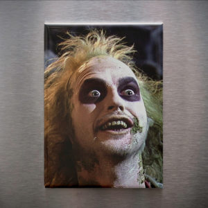 Feast your eyes on this magnet capturing Beetlejuice’s mischievous grin and wide, manic eyes, a perfect miniature portrait of the ghost with the most. This darkly comedic collectible is a must-have for any fan of Tim Burton’s 80s classic, bringing a touch of quirky, gothic charm (and just a hint of haunting hilarity) to any fridge or locker.