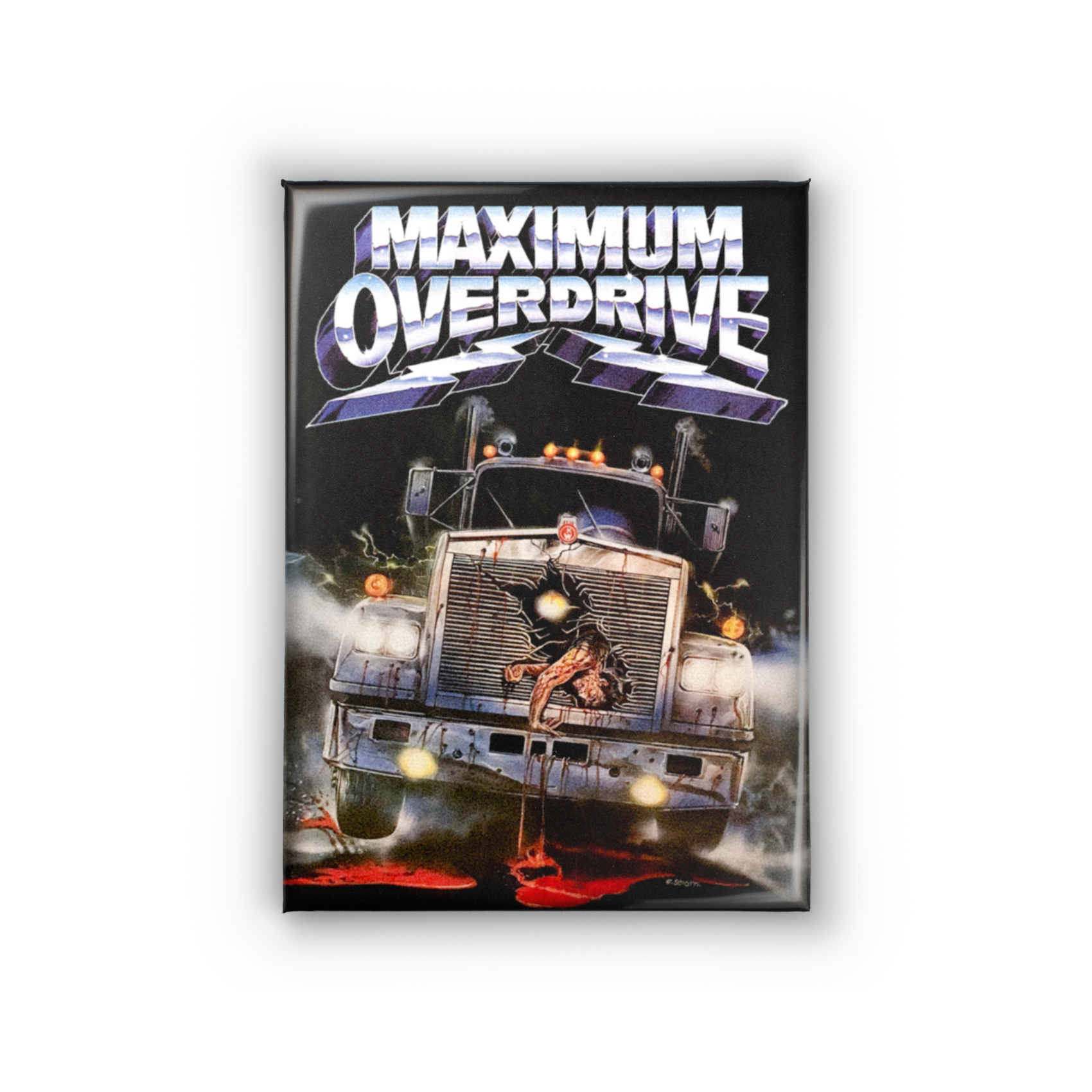 Witness the chilling visage of man vs. machine, a semi-truck brandishing its gruesome hood ornament – a victim of the electrifying mayhem that is *Maximum Overdrive*. This 2.5 x 3.5″ magnet isn’t just a cool retro collectible for your fridge or locker; it’s a darkly humorous nod to the 80s cult classic where sentient semis, electric knives, and vending machines unleash a chrome-plated reign of terror, perfect for fans of Stephen King, killer cars, and other delightfully demented delights.