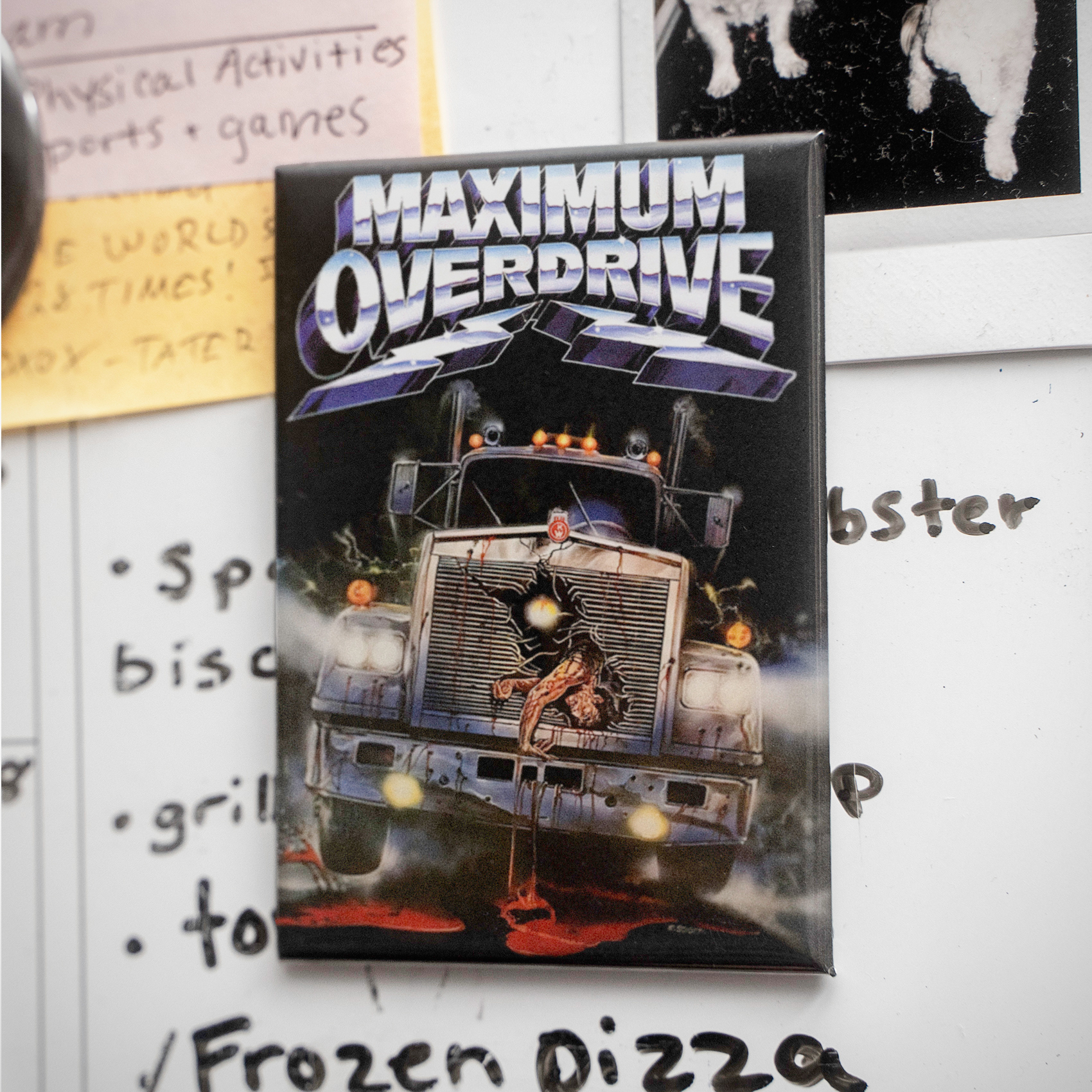 Witness the chilling visage of man vs. machine, a semi-truck brandishing its gruesome hood ornament – a victim of the electrifying mayhem that is *Maximum Overdrive*. This 2.5 x 3.5" magnet isn’t just a cool retro collectible for your fridge or locker; it’s a darkly humorous nod to the 80s cult classic where sentient semis, electric knives, and vending machines unleash a chrome-plated reign of terror, perfect for fans of Stephen King, killer cars, and other delightfully demented delights.