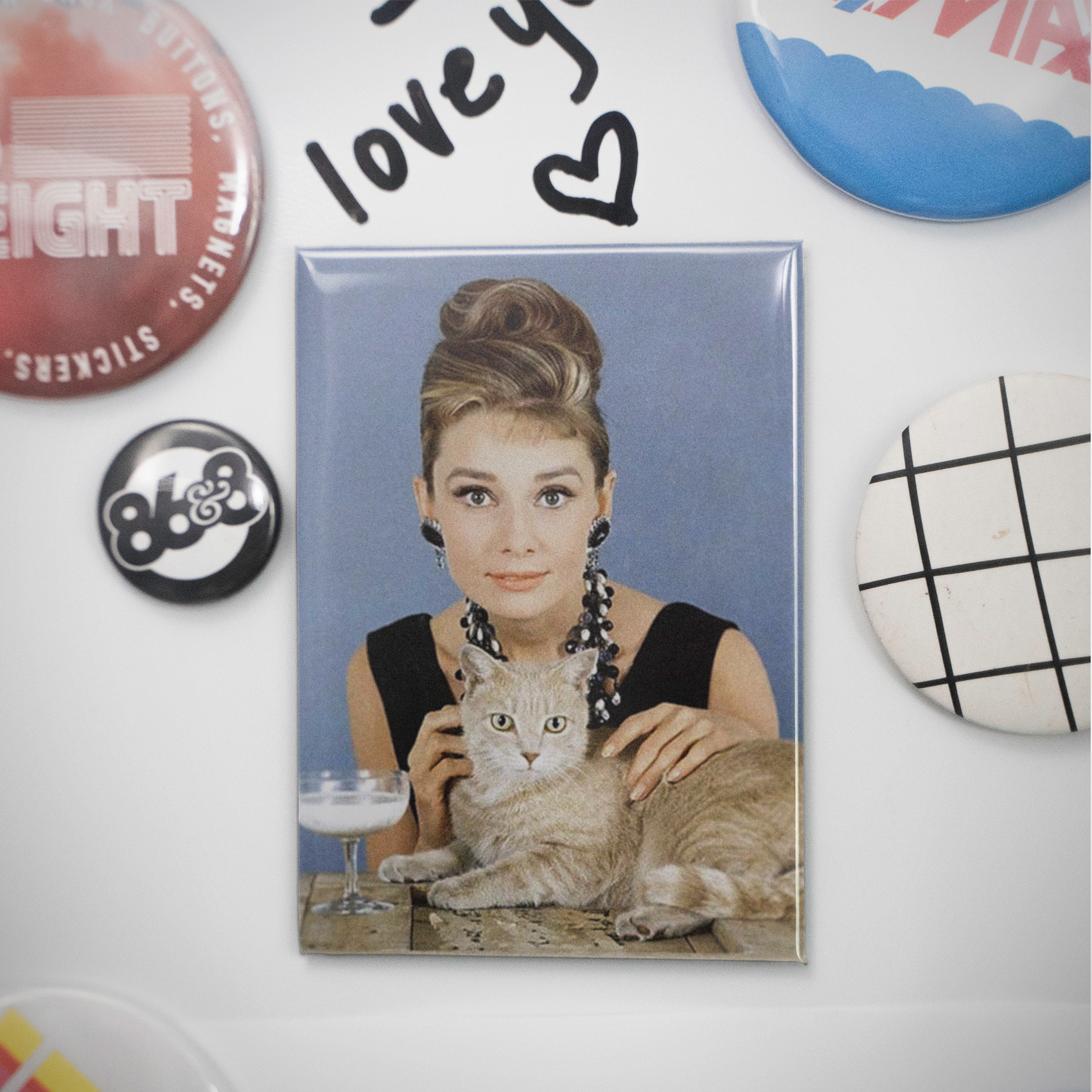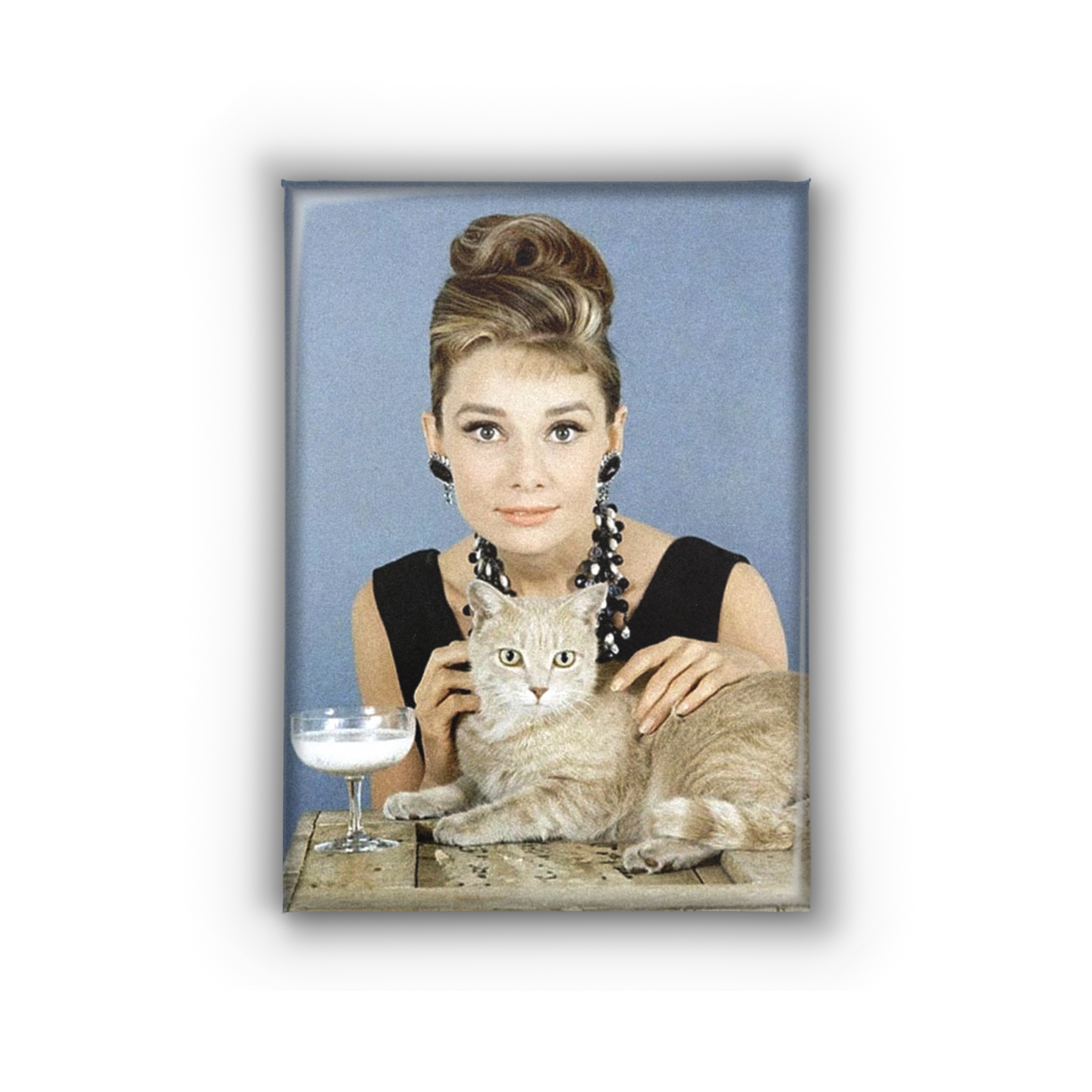Witness the epitome of grace, Audrey Hepburn, draped in a chic black dress, sharing a quiet moment with an adorable light brown cat over a glass of milk. This charming magnet, capturing a serene slice of mid-century Hollywood, is the purrfect vintage accent for any discerning Hepburn aficionado or cat lover’s fridge or locker.