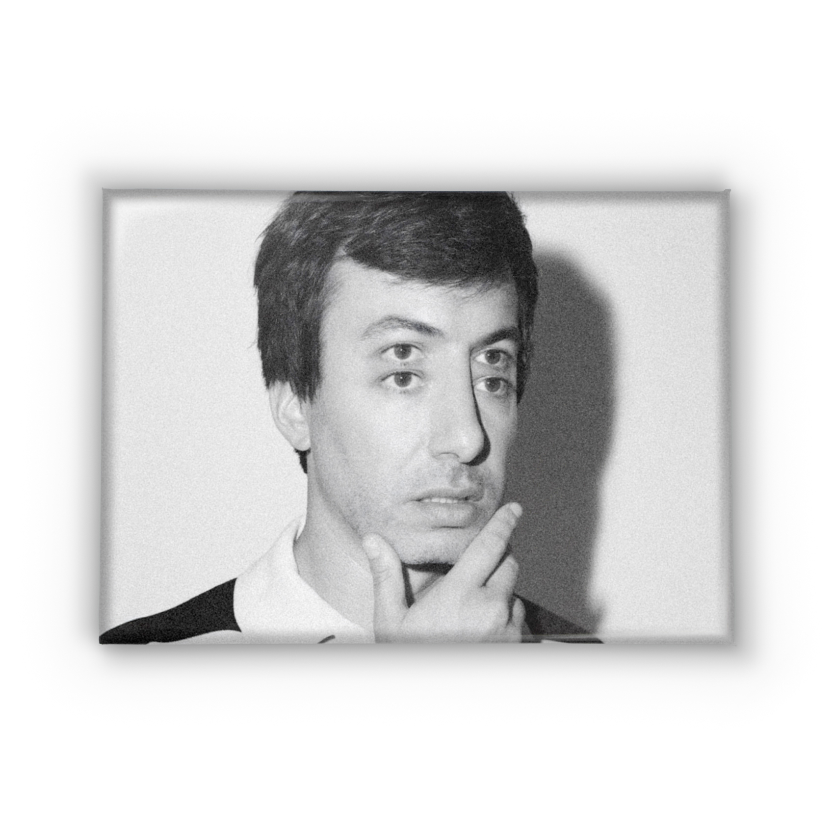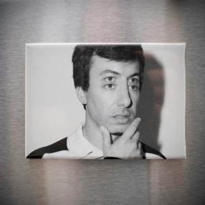 Behold Nathan Fielder, reimagined in monochrome with a double dose of ocular intensity, his chin resting pensively in hand. This unsettling yet hilarious magnet, featuring the four-eyed maestro of awkward comedy, is a must-have for any fan who appreciates the brilliantly uncomfortable genius of Fielder’s brand of surreal humor – the perfect conversation starter for your fridge or locker.