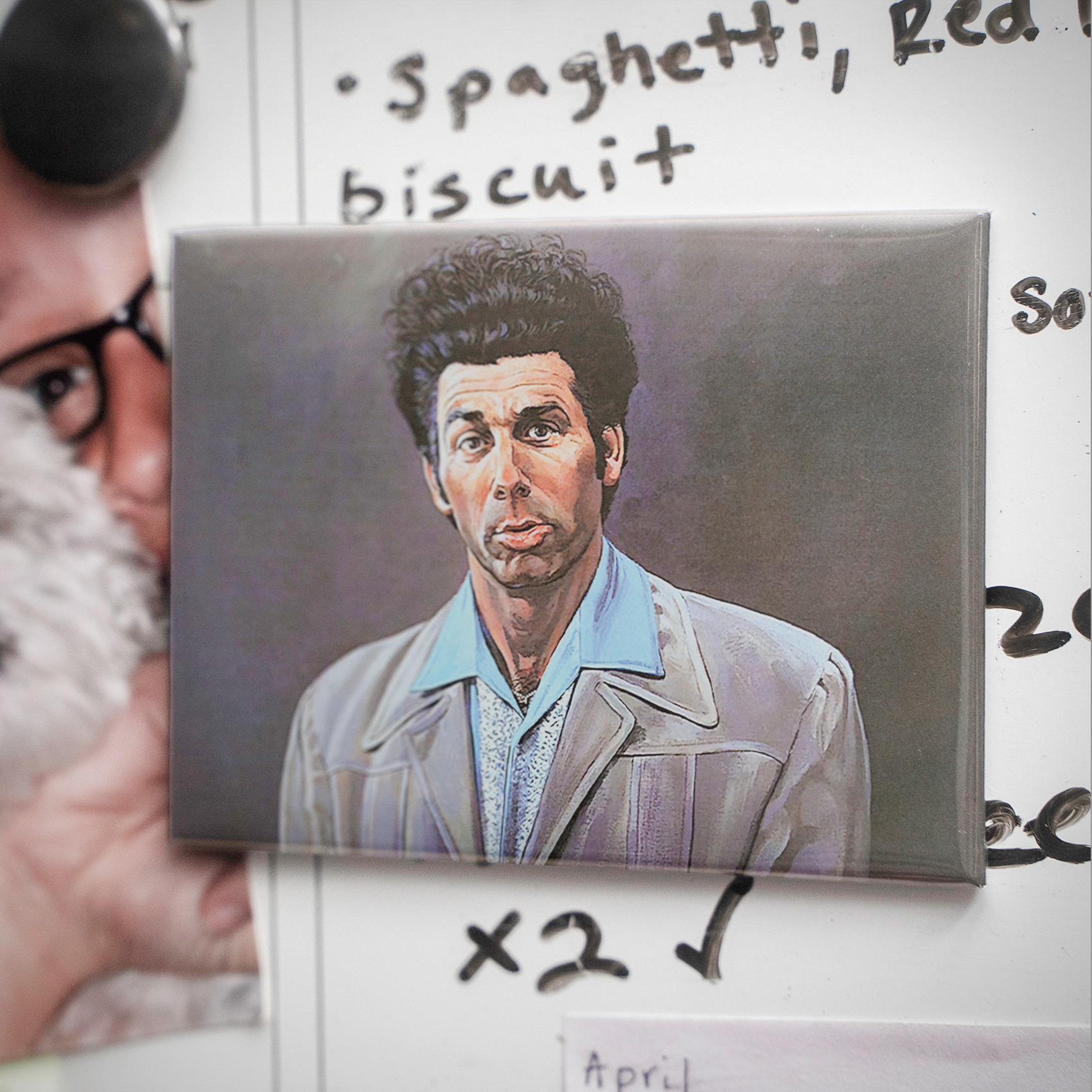 Behold the magnificent Cosmo Kramer, captured mid-entrance in his iconic blue shirt and rumpled brown jacket, looking every bit the high-art subject he never knew he was. This sophisticated magnet bottles all the eccentric, door-busting energy of 90s television’s greatest neighbor, creating the perfect conversation starter for any fellow aficionado’s fridge or locker.