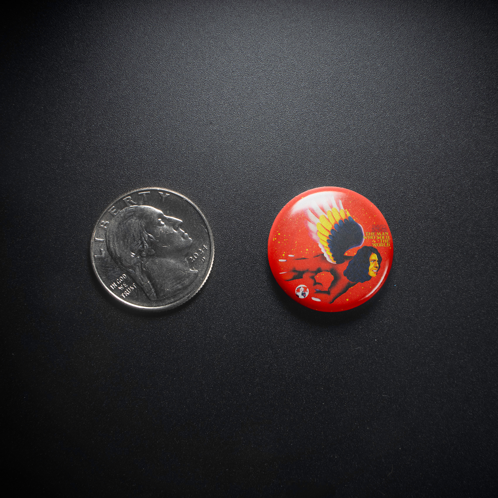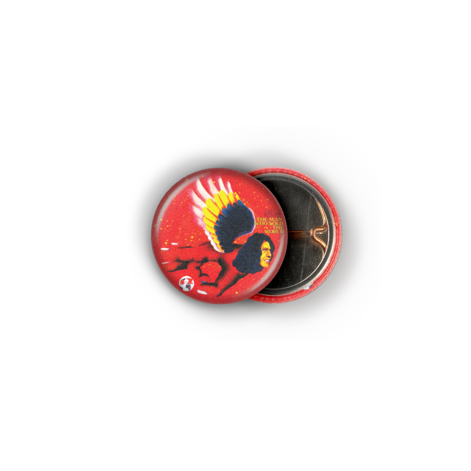 Witness the Starman ascend, wings spread against a cosmic red backdrop, boldly proclaiming "The Man Who Sold The World." This striking 1" pinback button, celebrating the chameleonic artistry of David Bowie, is a must-have for any discerning fan seeking a tangible piece of music and fashion history – a potent reminder of those electrifying decades when Bowie’s influence ignited the world.