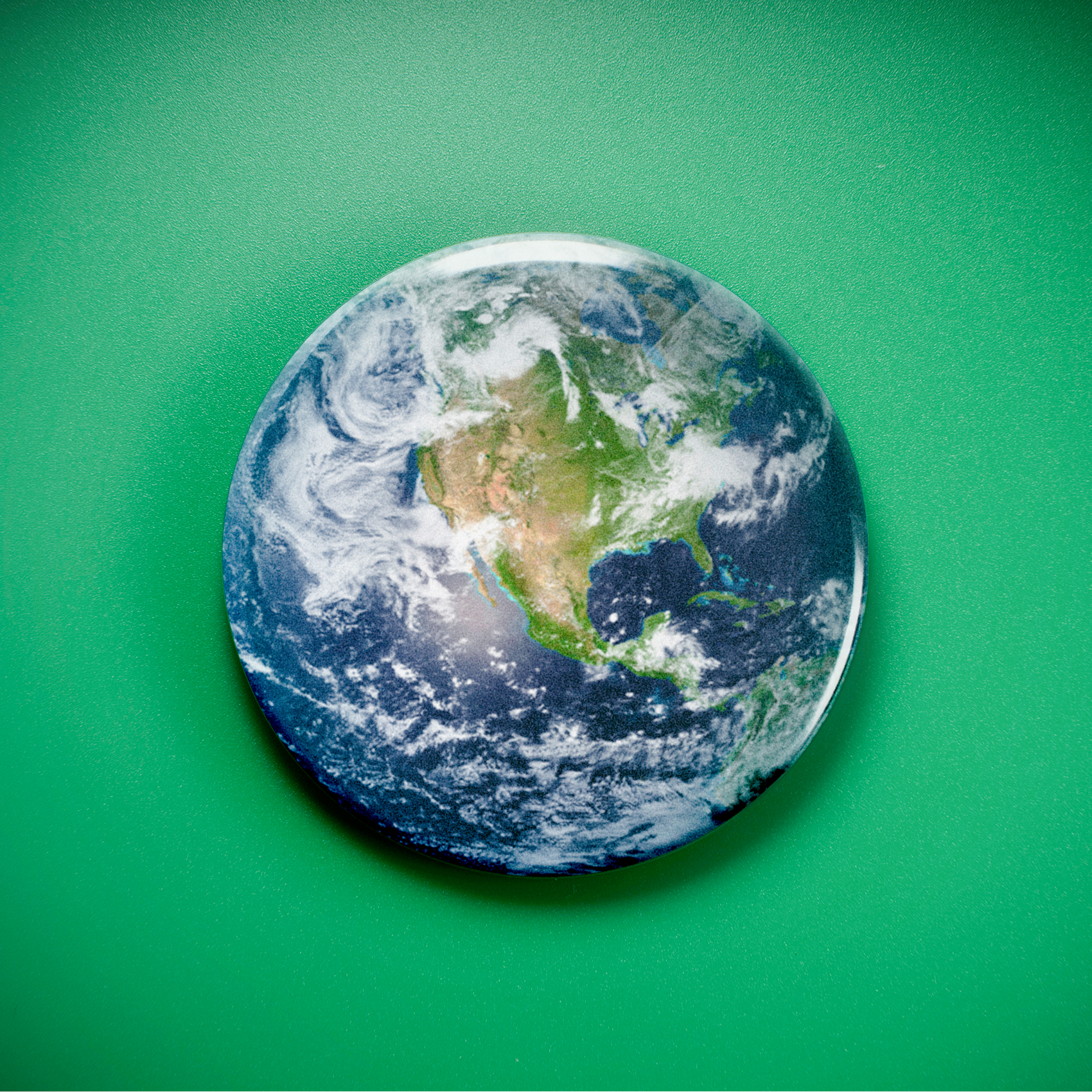 Behold this 2.25" button featuring a stunning image of Earth from space, North America taking center stage against a vibrant green backdrop. This unique perspective evokes the beauty and fragility of our shared home, a perfect conversation starter for environmentally conscious explorers, educators, or anyone who feels a deep connection to this pale blue dot we call home.