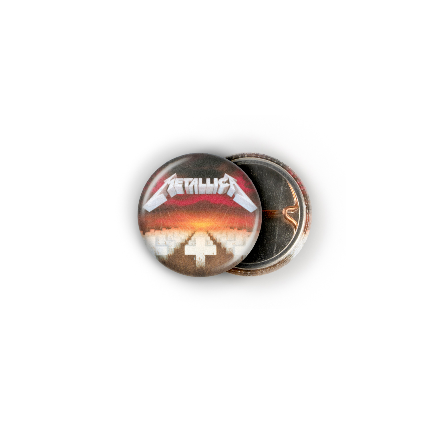 Witness the iconic Metallica logo blazing across a battlefield of white crosses, a fiery horizon hinting at the apocalyptic soundscapes within. This 1-inch pinback button isn’t just a piece of metal; it’s a portal back to the raw, rebellious energy of the ’80s, a badge of honor for those who know the ominous grandeur of *Master of Puppets* and the raw power of *…And Justice for All*.