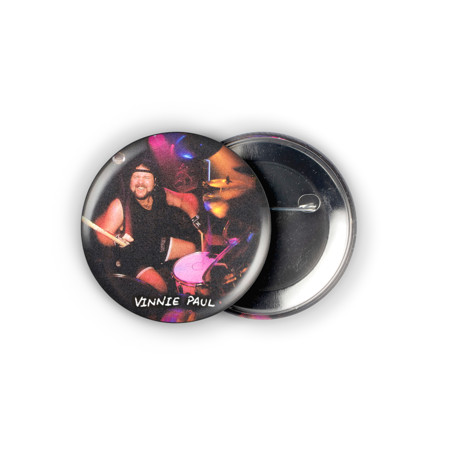 Own a piece of metal history with this killer Vinnie Paul 2.25" pinback button. For any die-hard Pantera fan who lived and breathed the raw energy of their 90s reign, this pin captures the thunderous power of Vinnie’s drumming and lets you carry a piece of that untamed groove wherever you go.