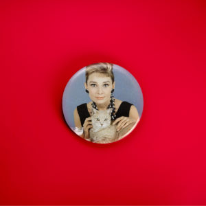 Behold the epitome of chic: a 1.5-inch button featuring Audrey Hepburn, flawlessly attired, sharing a tender moment with her adorable light brown cat. This charming pin captures the quiet grace of a Hollywood icon and her furry friend, a perfect piece for vintage enthusiasts, cat lovers, or anyone who appreciates the mid-century magic of Audrey’s timeless style.