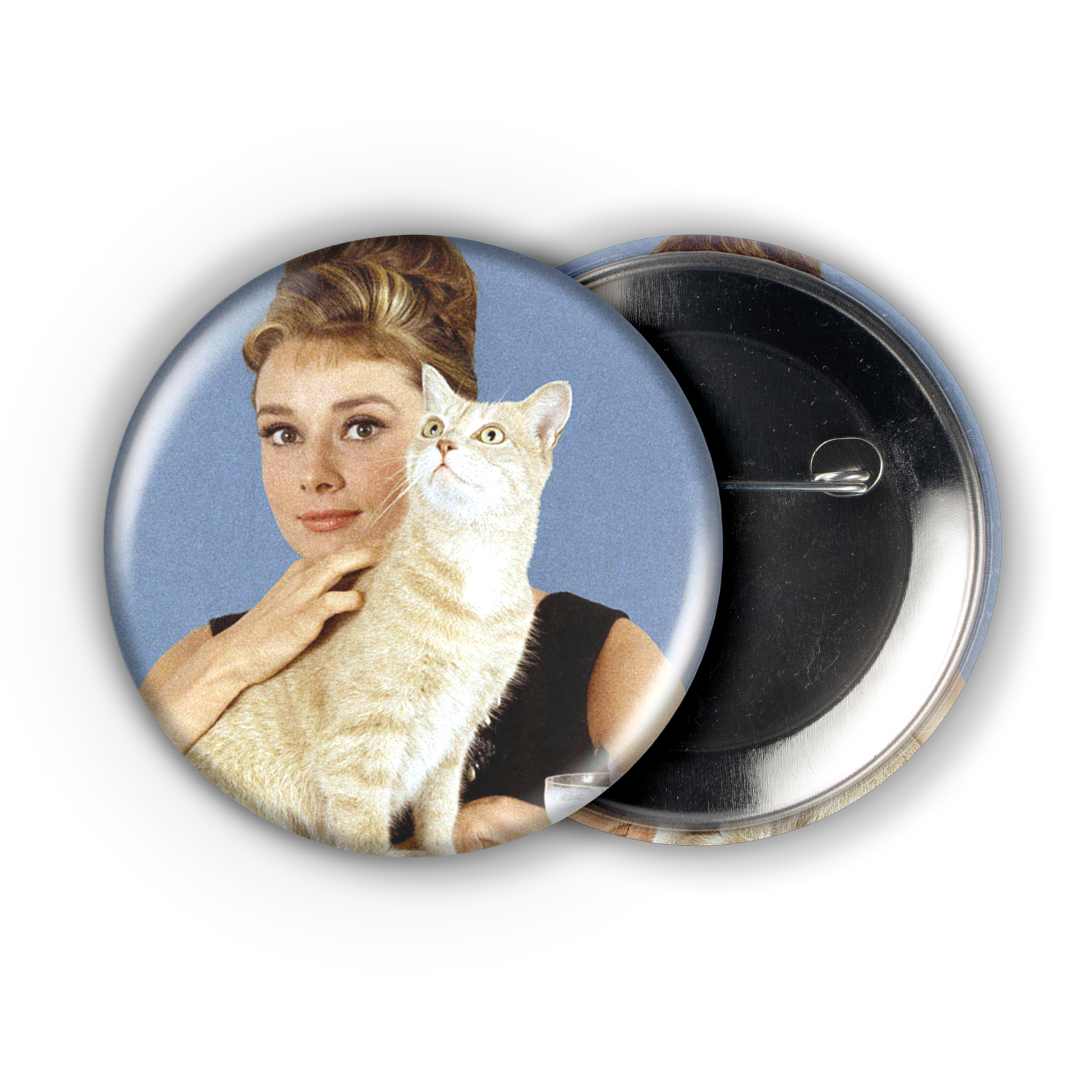 Against a serene sky-blue backdrop, Audrey Hepburn sits gracefully, an orange tabby perched lovingly on her arm. This charming 2.25″ pinback button perfectly captures the quiet elegance of a mid-century icon, a must-have for any collector who appreciates vintage glamour, feline affection, and the timeless allure of Hollywood’s golden age.