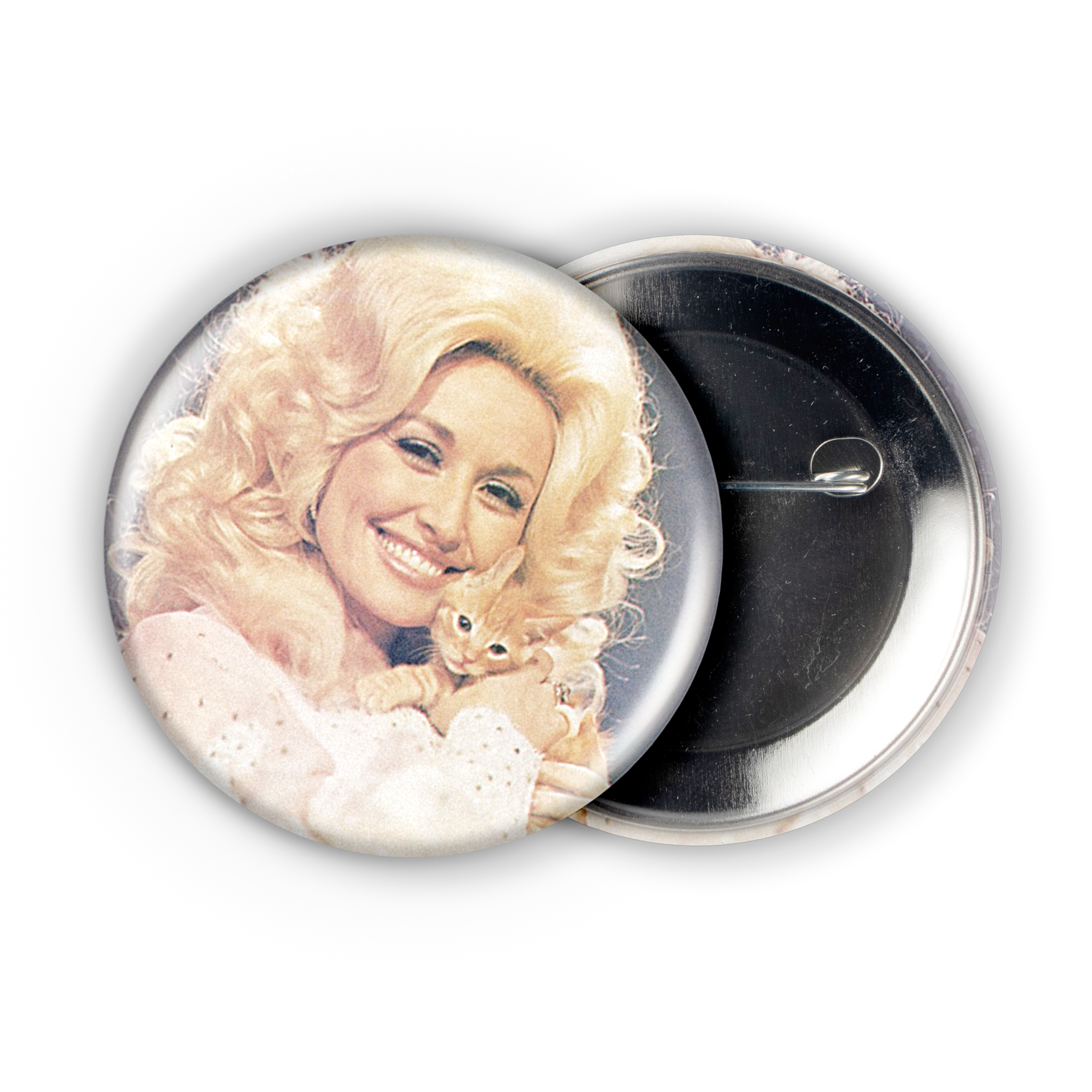 Dolly Parton With A Kitten 2.25in Pin | 70s Country Music Kitten Portrait