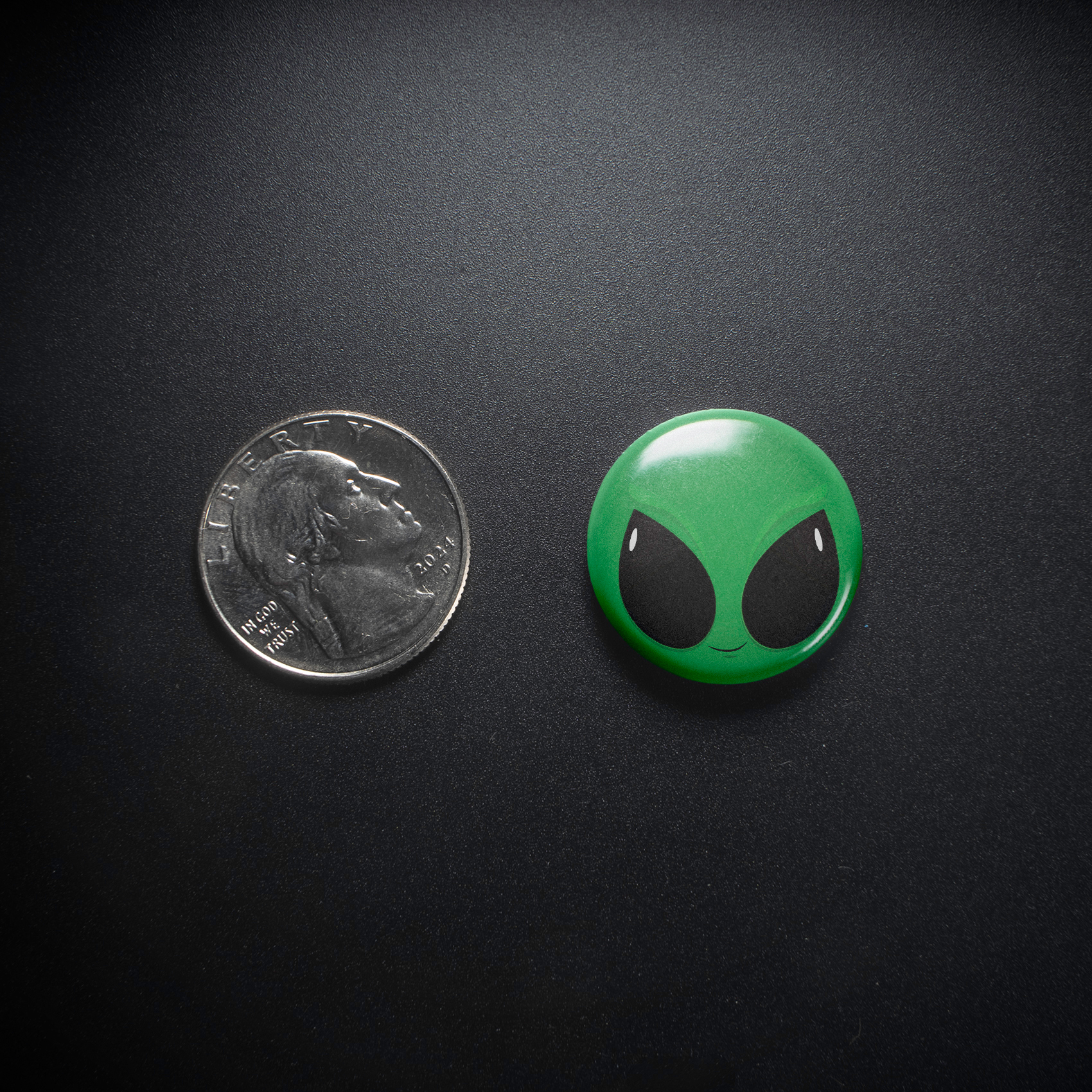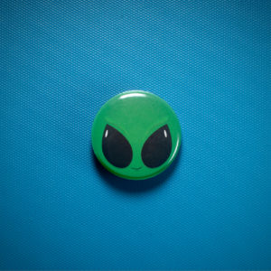 Gaze into the friendly emerald grin and mesmerizing black eyes of this little 1-inch alien pinback button, radiating a playful, mischievous vibe. This quirky piece of contemporary cool is perfect for Gen Z and Millennial collectors who dig retro-inspired cuteness and want to add a touch of extraterrestrial charm to their backpacks, jackets, or corkboards – because who doesn’t love a bit of intergalactic flair?