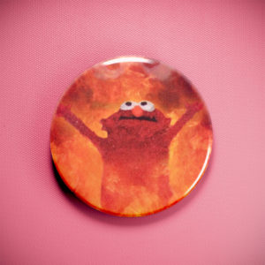 Behold Elmo, not tickling Big Bird’s tummy, but engulfed in a glorious inferno, tiny arms outstretched in ecstatic surrender to the flames. This 2.25″ pinback button perfectly captures that sweet spot of internet absurdity, a nostalgic wink to childhood innocence twisted by the fiery chaos of meme culture—perfect for anyone who finds humor in the slightly (okay, maybe very) dark side of the web.