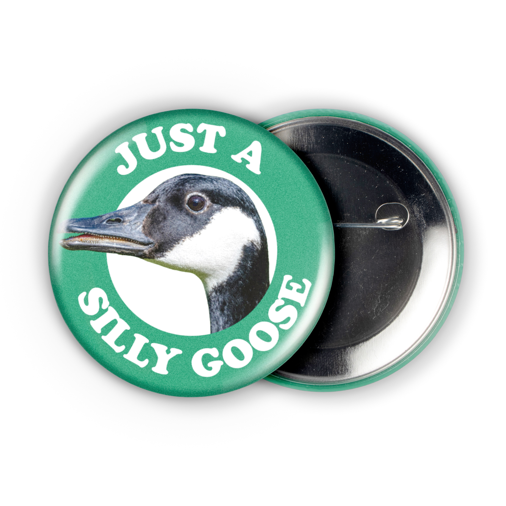 Behold, a perfectly plump Canada goose head, nestled within a verdant circle and crowned with the retro-styled phrase "Just A Silly Goose"—a tiny masterpiece of feathered absurdity. This 2.25-inch pinback button is a must-have for anyone who appreciates the quirky charm of our sometimes-menacing, often-hilarious avian overlords, adding a touch of whimsical mischief to your backpack, jacket, or favorite bird-watching hat.