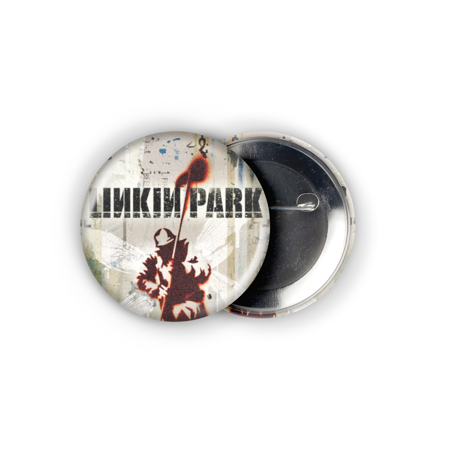 Witness the iconic Linkin Park logo soar above a winged soldier, flag held high against a textured, collage-style backdrop—a perfect microcosm of Hybrid Theory’s raw energy. This 2.25″ pinback button isn’t just merch; it’s a portal back to the early 2000s, a tangible piece of that angst-ridden, rebellious spirit that defined a generation and still resonates with anyone who felt the raw emotion of Linkin Park’s groundbreaking sound.
