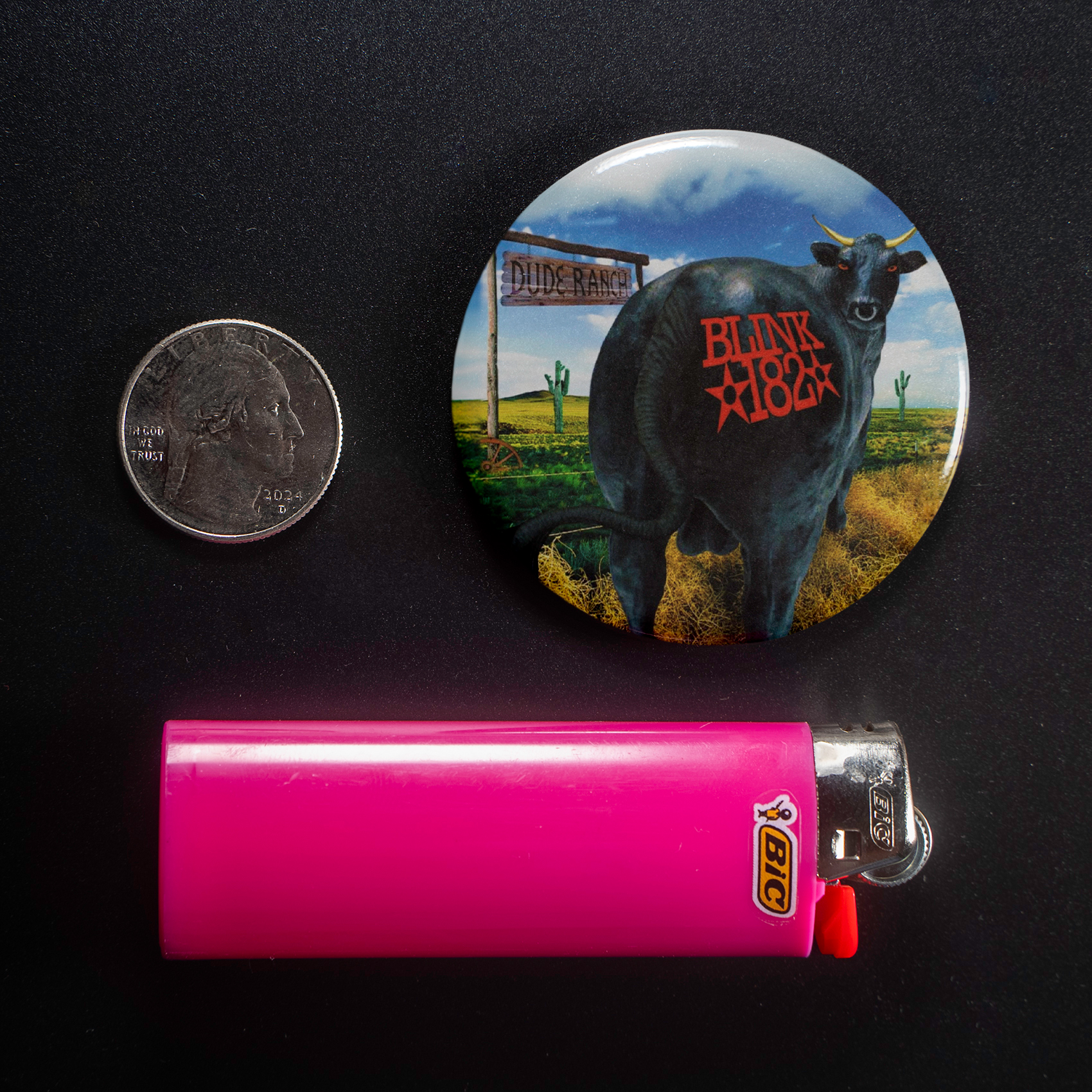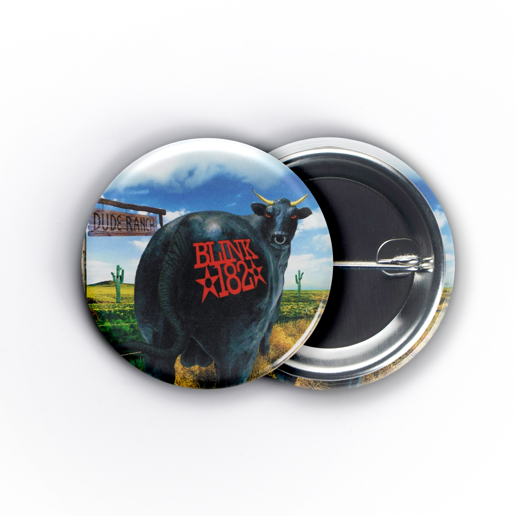 Witness the majestic (and slightly cheeky) black bull, presiding over the Dude Ranch desert landscape, complete with signage and a Blink-182 brand on its rump – a tiny, wearable monument to pop-punk’s glorious heyday. This 1.5” pinback button isn’t just merch; it’s a portal back to the late 90s, a tangible piece of your misspent youth soundtracked by infectious riffs and Mark, Tom, and Travis’s signature irreverence.