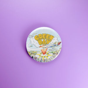 Witness the glorious chaos of exploding toilets, quirky characters, and a plane skywriting “Dookie” – all crammed onto this 1.5″ Green Day pinback button. A blast of pure 90s punk nostalgia, this pin isn’t just a piece of memorabilia; it’s a tiny portal back to mosh pits, ripped jeans, and the raw energy of “Dookie” blasting from your Discman. Slap this bad boy on your jacket, backpack, or whatever canvas of rebellion you choose, and let your inner punk roar.